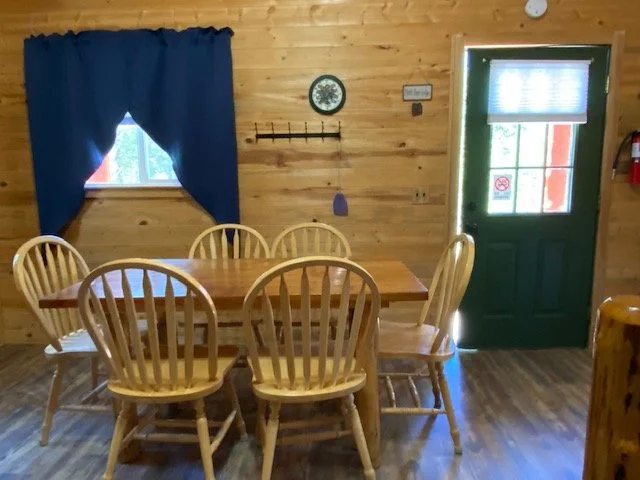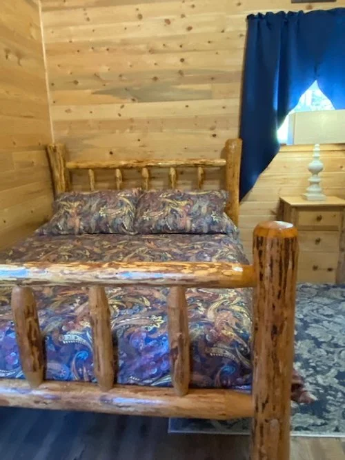 Log sided camping cabin (16′ X 16′), front porch (5′ X 16′), one queen bed, two double bunk beds, table with six chairs, outside water faucet, picnic table, barbecue/campfire grill, parking area, ceiling fan/light, table with chairs, heater, an electrical outlet and restrooms with clean showers available on property.