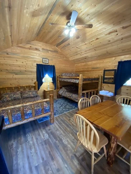 Log sided camping cabin (16′ X 16′), front porch (5′ X 16′), one queen bed, two double bunk beds, table with six chairs, outside water faucet, picnic table, barbecue/campfire grill, parking area, ceiling fan/light, table with chairs, heater, an electrical outlet and restrooms with clean showers close by.