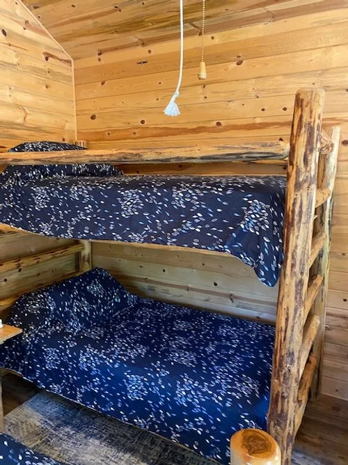 Log cabin, 12′ x 14′, it offers 1 Double Bed, 1 Twin Bunk Bed and sleeps up to 4 people. It provides an outside water faucet, picnic table, BBQ/campfire grill, parking area, refrigerator, ceiling fan/light, table with two chairs, heater, an electrical outlet, and the showers and restrooms are nearby.